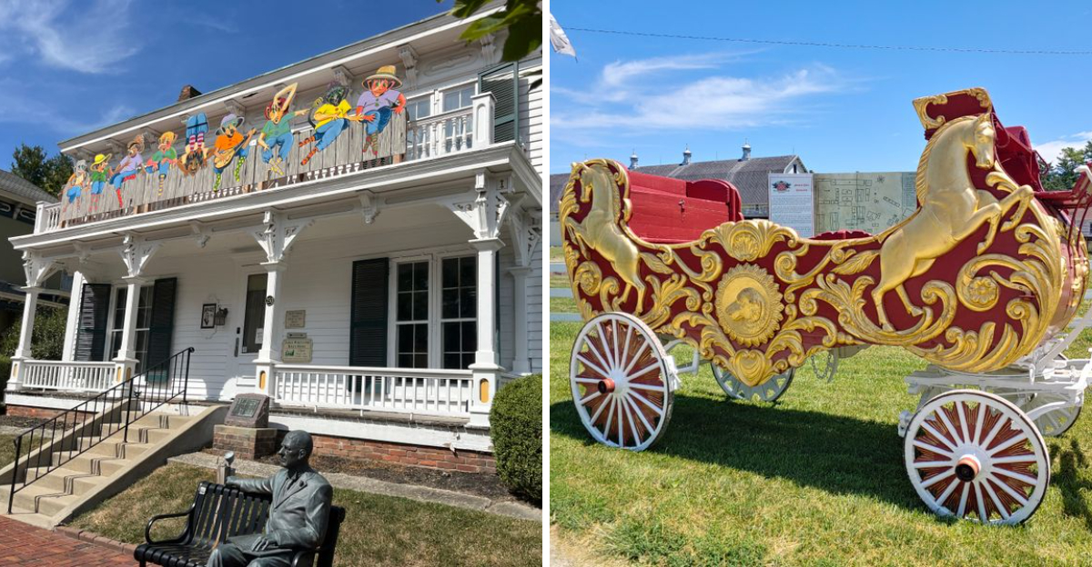 Vintage circus wagons painted in brilliant colors sit throughout the property, each one meticulously restored to show how performers traveled.