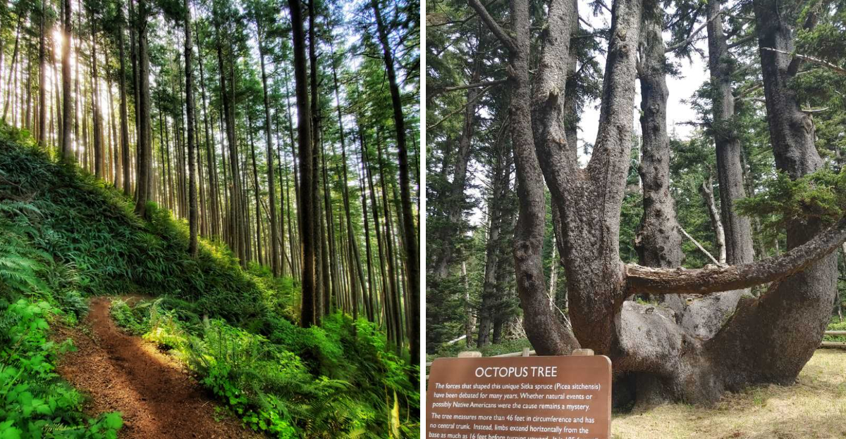 Perched near the edge of Cape Meares, this legendary Sitka Spruce earned its nickname for good reason. Instead of shooting straight up like most trees, it spreads its massive limbs horizontally across the ground, each branch thick as a normal tree trunk.