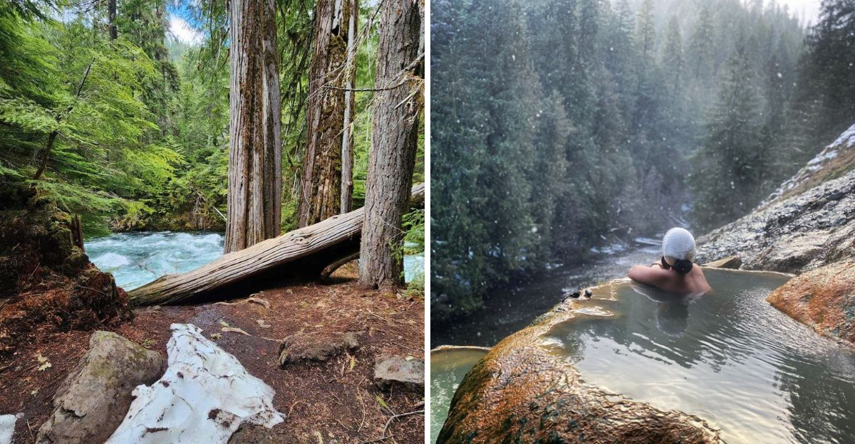 Minerals in the water create the distinctive green tint while also leaving colorful deposits on rocks that frame each pool. Soaking in the warm water while surrounded by towering evergreens and listening to the river rushing through the canyon below engages all your senses simultaneously.