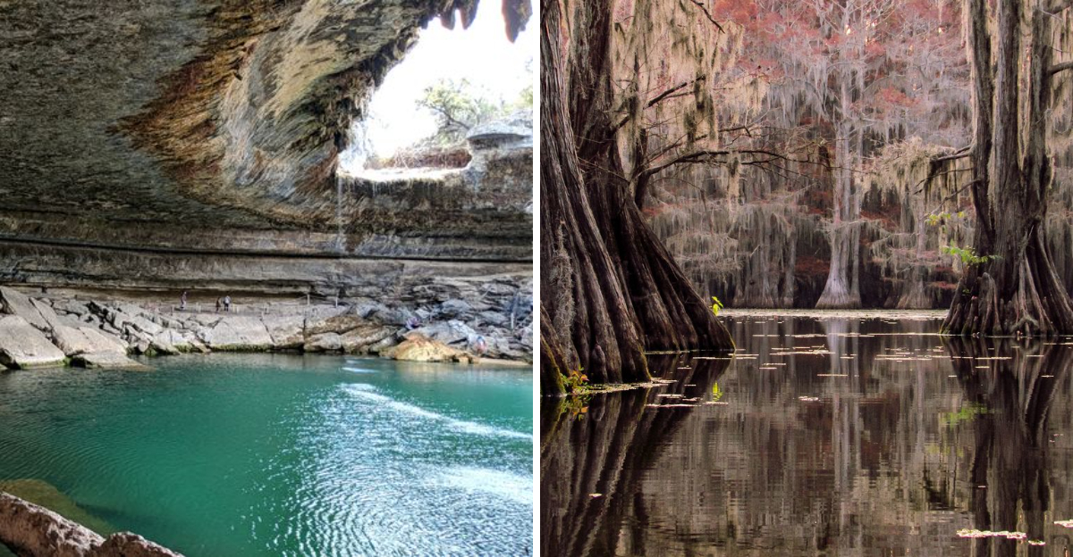 Caddo Lake, straddling the Texas-Louisiana border, is the only naturally occurring large lake in Texas, formed by a massive logjam on the Red River centuries ago.