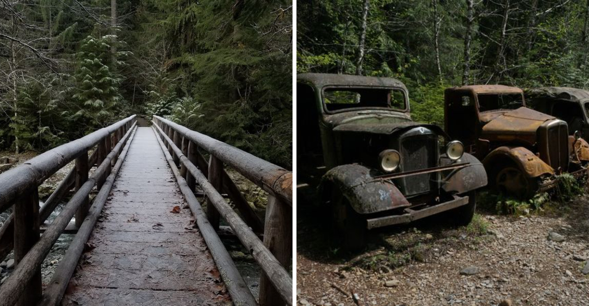Some of the original mining machinery still sits in the forest, slowly being reclaimed by moss and roots. Rusted equipment beside the trail offers a tangible connection to the people who once worked this land.