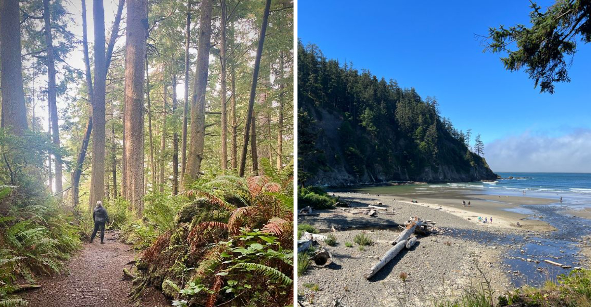 These old-growth trees have been standing here for centuries, watching waves roll in and storms pass through. Light filters through the canopy in golden beams that make you want to stop and stare.