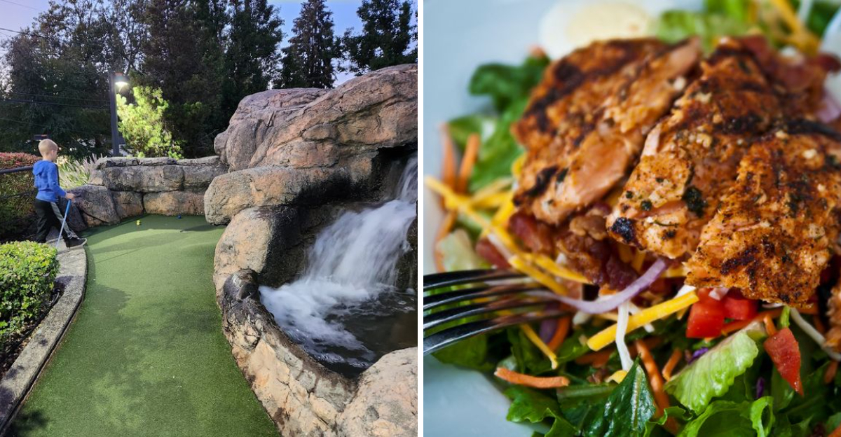 A sizzling steakhouse meal and a full round of mini golf don’t usually belong in the same sentence, but this Oregon spot makes it work effortlessly. It’s the kind of place where dinner doesn’t mark the end of the outing – it just sets you up for the next round of fun.
