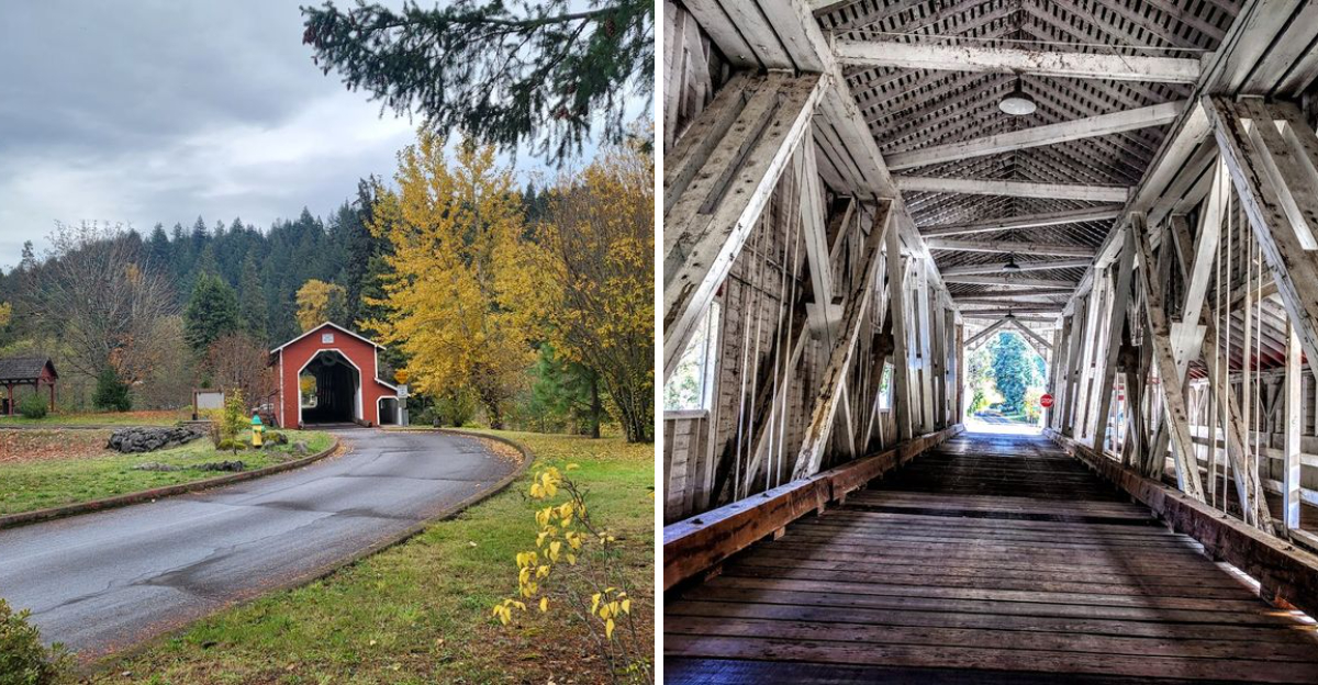 Oregon has many covered bridges, but most are closed to vehicle traffic. This one still lets cars and trucks roll right through.