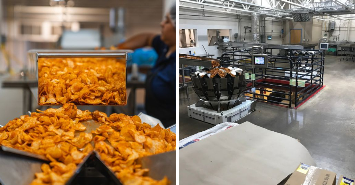 Potatoes arrive, get washed and sliced, then drop into the kettles for that signature fry. After cooking, they move through seasoning stations where the bold flavors get applied with precision before the finished chips head into bags.