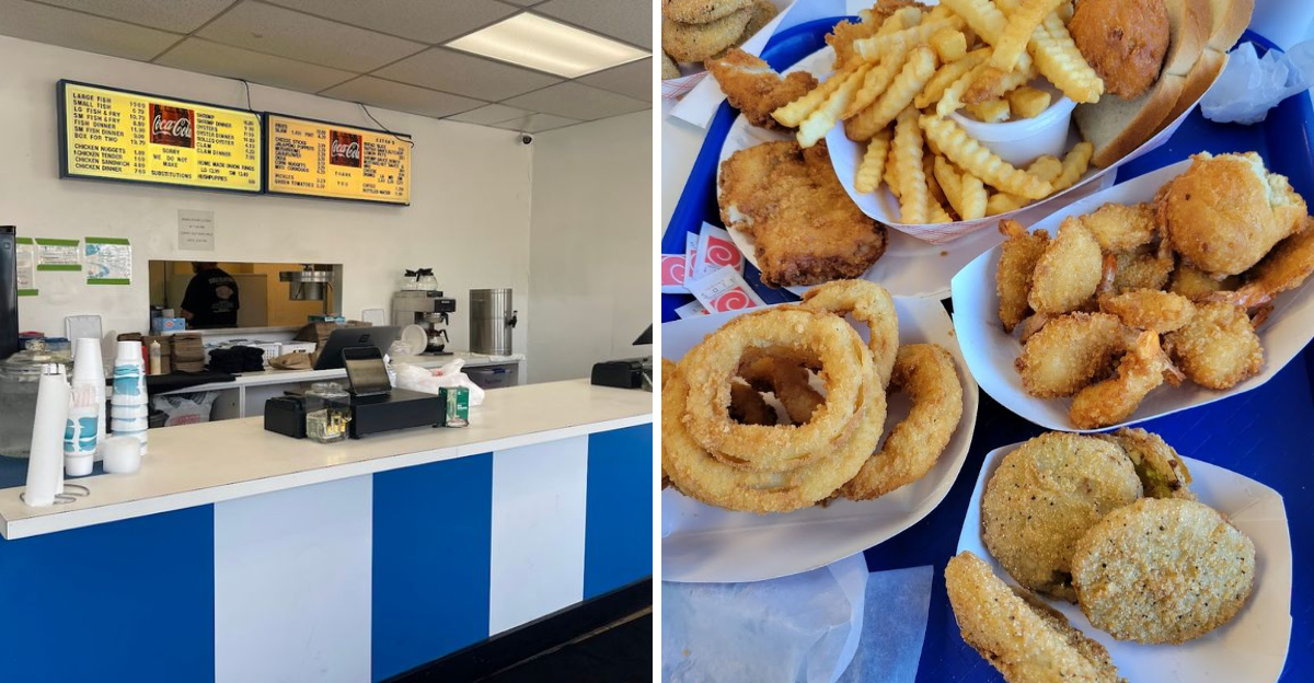 The menu features cod, shrimp, fish sandwiches, onion rings, fries, coleslaw, hush puppies, and fried green tomatoes, which is enough variety to satisfy most cravings without overcomplicating things.
