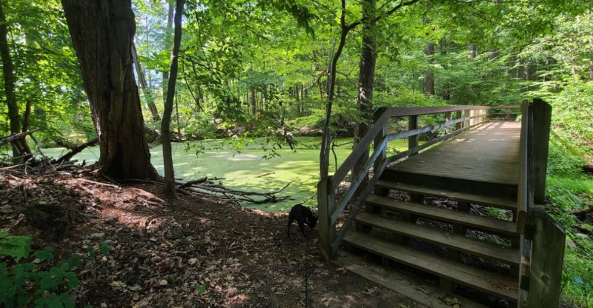 The trail is rated easy with only about 124 feet of elevation gain, making it accessible for families, older hikers, and anyone who wants a peaceful walk without a serious workout. The packed dirt path crosses three small bridges, dips through shaded hollows, and occasionally opens up to views of the bog below.