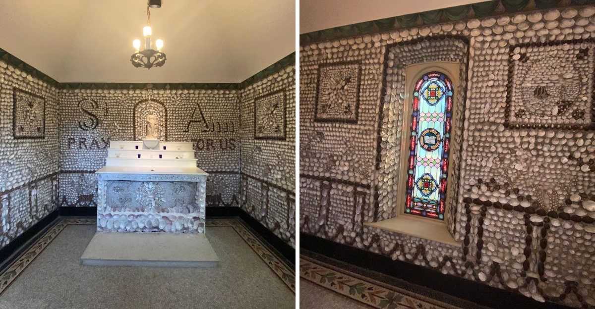 What makes this chapel truly unforgettable is where those shells came from. Sister Mary Joseph Le Fer de la Motte, along with other novices, personally gathered shells from the Wabash River to create the mosaics that cover nearly every surface inside.