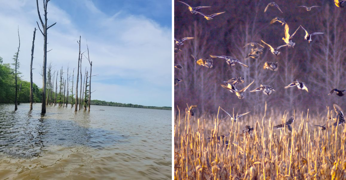 Hovey Lake is one of the only places in Indiana where bald cypress trees grow naturally, making it a genuinely rare ecological pocket in the Midwest. The flooded forest creates a layered habitat that feels dense and alive in a way that open water simply cannot.