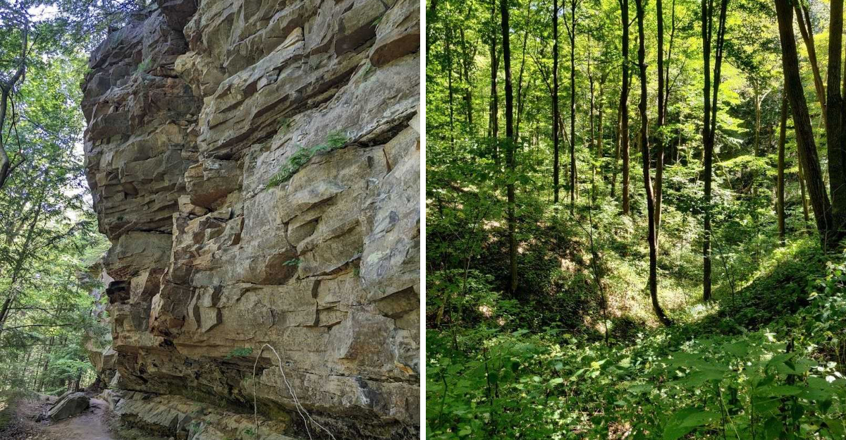 I have hiked a lot of trails across Indiana, and few have stopped me in my tracks the way this nature preserve did the first time I rounded a bend and came face to face with a towering sandstone bluff draped in eastern hemlock trees. The layers of rock rise dramatically from the forest floor, and sunlight filtering through the trees casts shifting patterns across the moss-covered ground.
