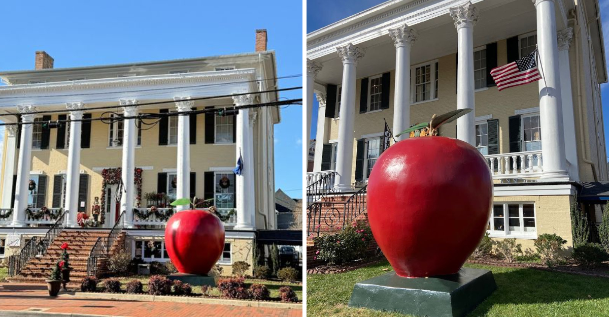 You do not expect a giant apple to be the highlight of a road trip, but this one earns its spot instantly. In Virginia, a massive apple sculpture stands boldly in front of an elegant antebellum mansion, catching the eye of anyone passing through.