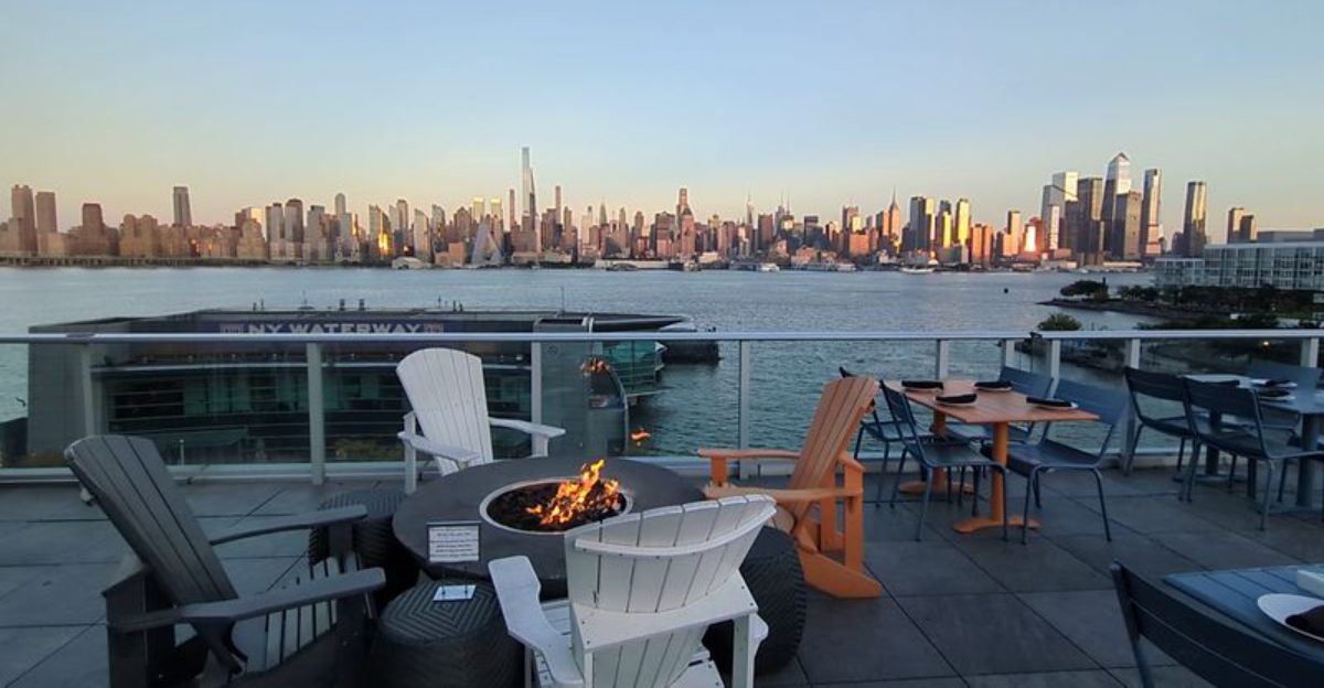 The rooftop sits on the sixth floor, which sounds modest until you realize the Hudson River is right there, and the city lights are practically close enough to touch. There is no towering building blocking the view, no awkward angle to navigate.