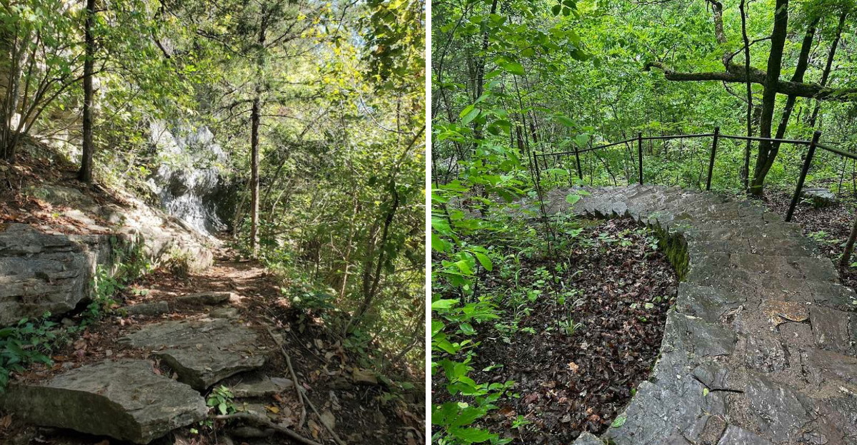 Let me be upfront about something: those stone steps are no joke. Carved into the hillside and descending sharply toward Lake Taneycomo, the roughly 315 steps are the kind of feature that makes your legs burn and your jaw drop at the same time.