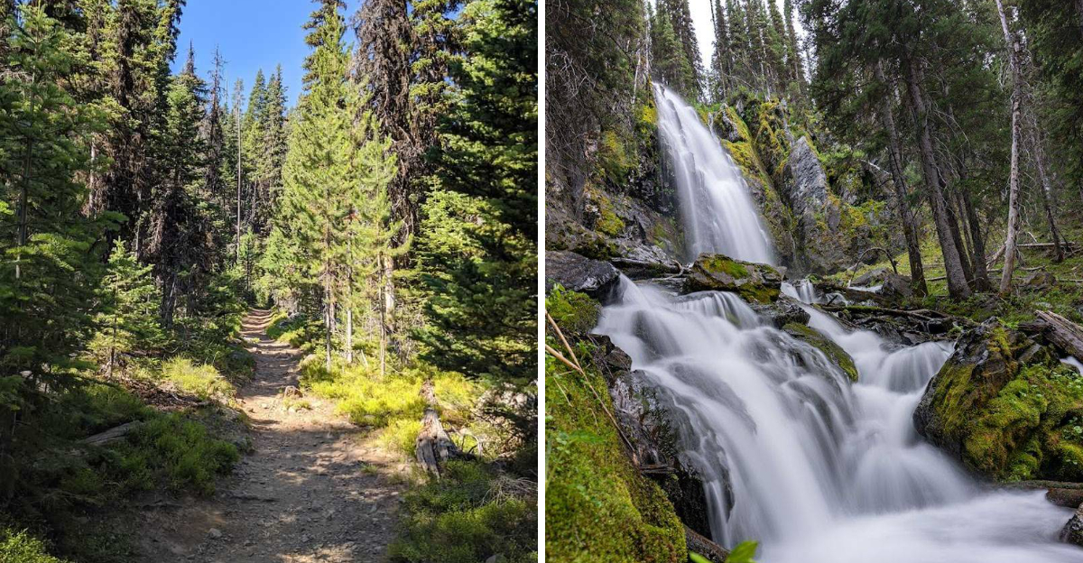 The falls are fed by snowmelt and run strongest in late spring and early summer. By late August, the flow slows but remains scenic.