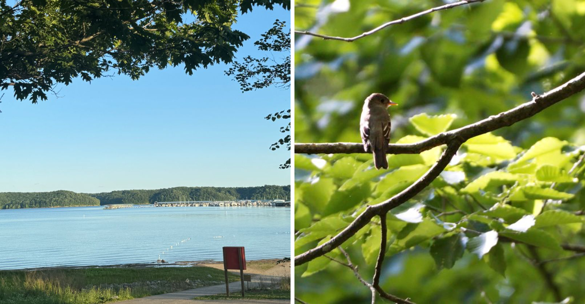 Red-tailed hawks also patrol the area, their piercing calls echoing across the water. Deer emerge from the woods during quieter morning and evening hours, sometimes approaching surprisingly close to picnic areas.