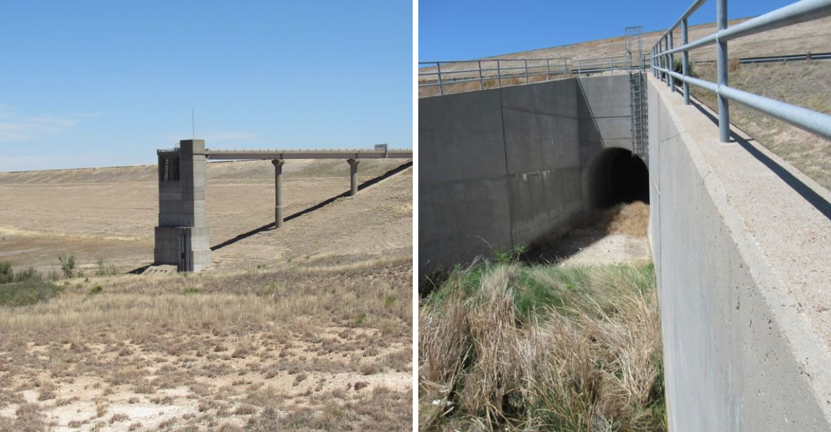 Engineers built the structure to handle enormous volumes of water. The spillways, the embankments, and the control structures are all intact and functional in a technical sense.