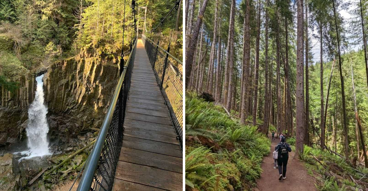 The combination of a towering suspension bridge, a roaring waterfall, and ancient forest all packed into a short hike is genuinely rare.