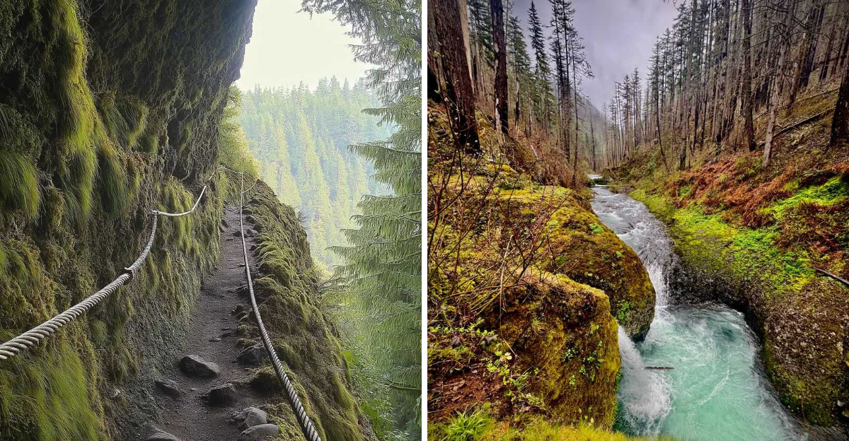 Deep in the Columbia River Gorge, Eagle Creek leans hard into drama. I find myself gripping safety cables, getting misted by waterfalls, and stepping through tunnels blasted straight through rock.