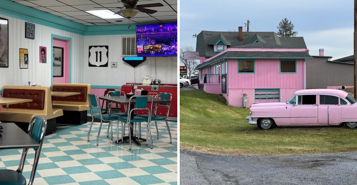 Along a quiet stretch of highway in Virginia, surrounded by rolling green hills and wide open sky, there is a diner that feels pulled from another time. Bright neon glows against polished chrome, and the presence of the King of Rock and Roll is impossible to miss before you even step inside.