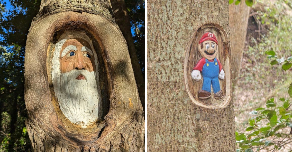 Blink and you might miss it, but just outside Warsaw, Virginia, a stretch of forest transforms into something unforgettable. Along a quiet trail, living trees are carved and painted with more than a hundred figures, characters, and creatures, turning the woods into a scene that feels pulled from a storybook.
