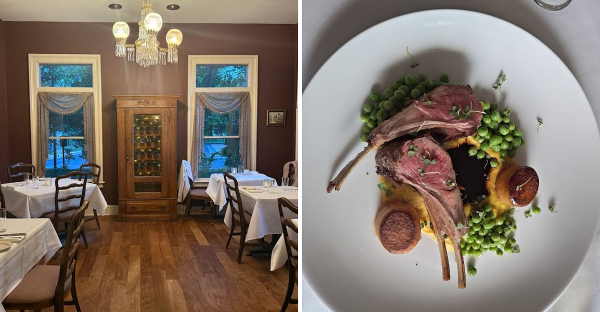 Walking up to the front entrance feels like stepping onto a movie set, except everything here is completely real. The original woodwork, intricate exterior detailing, and sweeping porch with rocking chairs all signal that this is not your average dining destination.