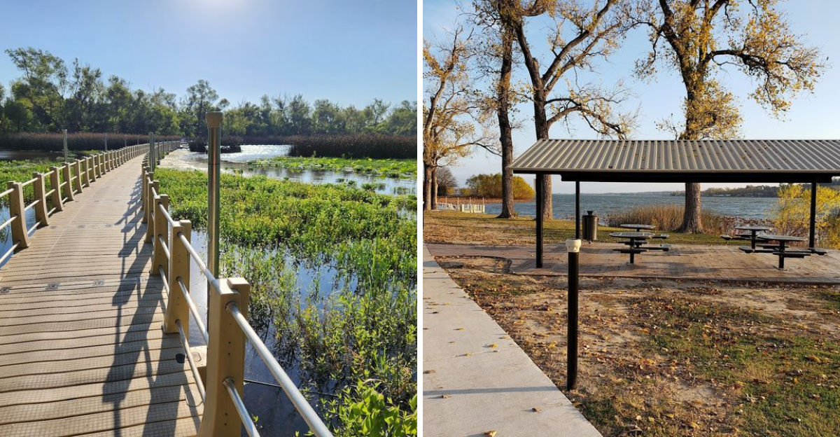 The boardwalk is constructed from paved concrete and wooden sections, both with sturdy railings on either side. At 10 feet wide, it never feels cramped, even when other visitors are out enjoying the trail.