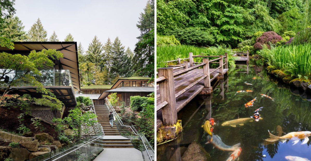 Covered walkways connect the main pavilion to different parts of the garden, giving you a sheltered spot to pause and look out at the trees. On a rainy Portland day, these covered passages feel especially welcome.