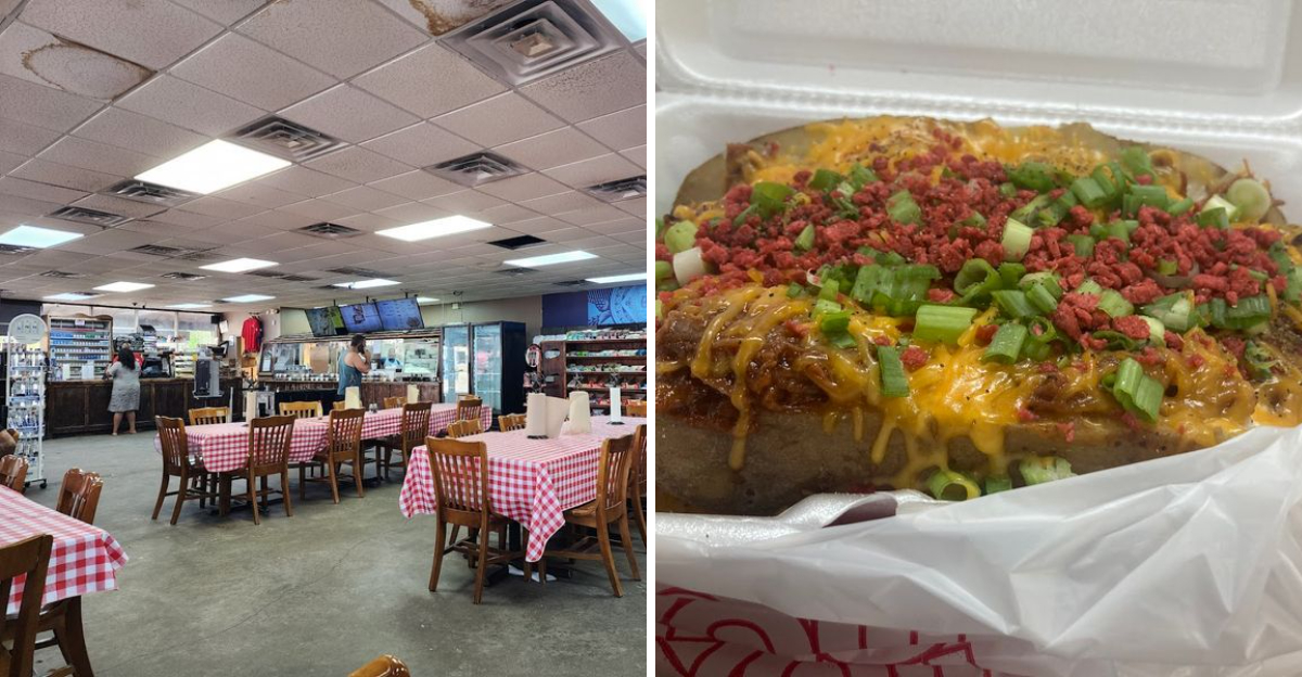 The combination of a 24-hour convenience store and a serious barbecue kitchen under one roof is genuinely practical for road trippers. You can fuel up your car, grab a cold drink, and sit down to one of the best loaded baked potatoes in the state all in one stop.