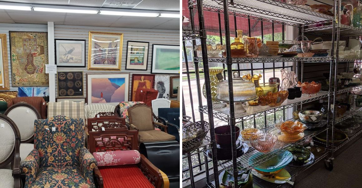 The shop stocks an impressive mix of collectibles, home accents, lighting, furniture, clothing, and jewelry. It is run as a consignment operation, meaning pieces are brought in by donors and sellers, then priced and displayed by the staff.