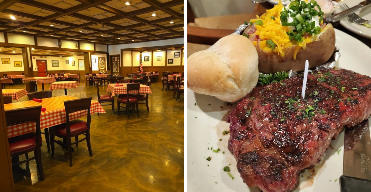 The checkered tablecloths, the wooden accents, the ranch-style details throughout the dining room all feel like they grew naturally out of decades of use rather than a designer’s mood board.