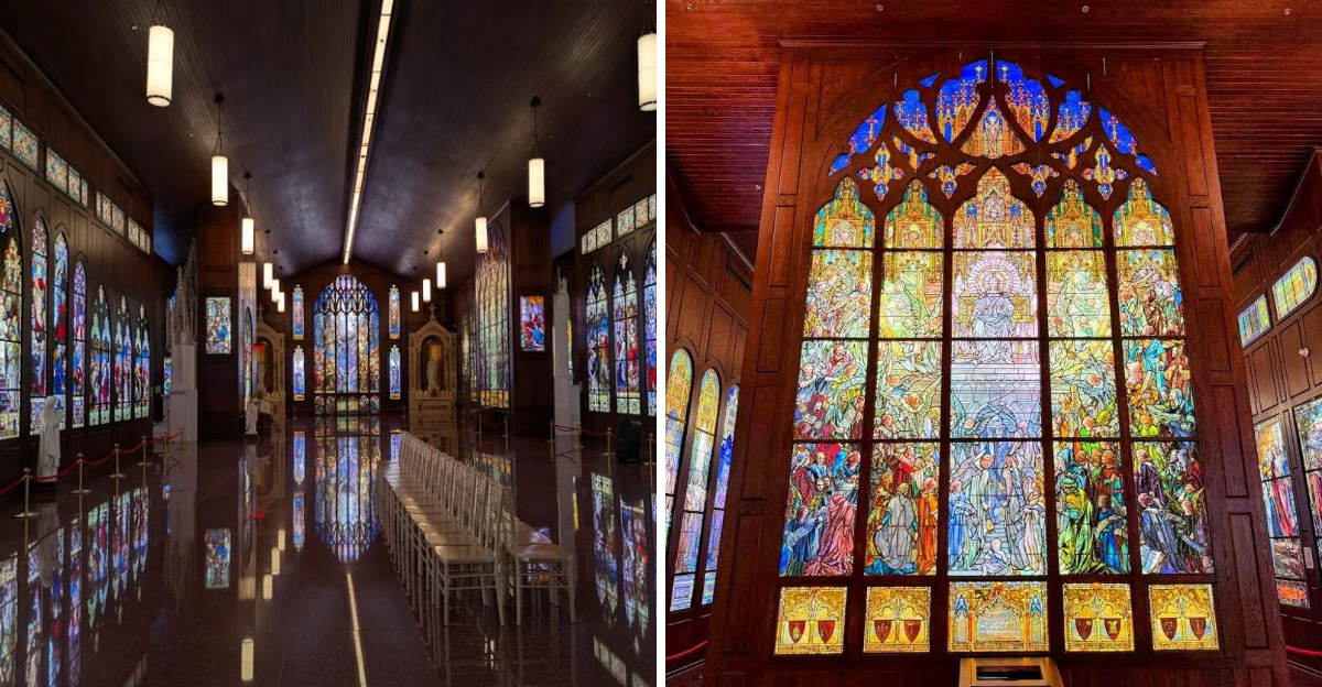 The architecture alone is reason enough to pull over. The Gelman Stained Glass Museum was designed in a Latin-cross cruciform layout, a shape traditionally used in European medieval cathedrals, and that choice was not accidental.