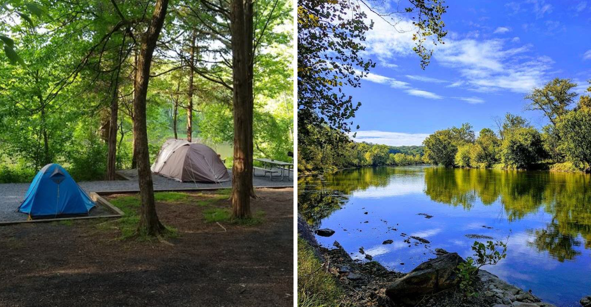 There is something almost unfair about how close you can get to the water here. The River Right Campground at Shenandoah River State Park features walk-in, tent-only sites, and some of them sit fewer than fifty yards from the parking area, placing you practically on the riverbank.