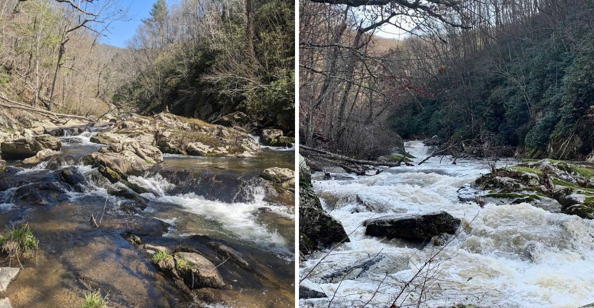 The gorge walls rise steeply on both sides, creating a microclimate that stays cooler and more humid than the surrounding uplands. That cooler air is part of why brook trout can survive here when they have disappeared from so many other Virginia streams affected by warming temperatures.