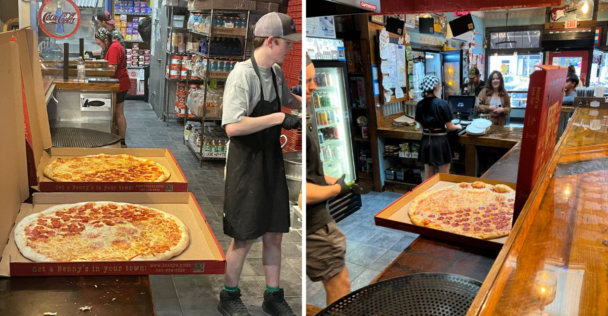 Grabbing a slice to go? You’ll need both hands to carry that box.