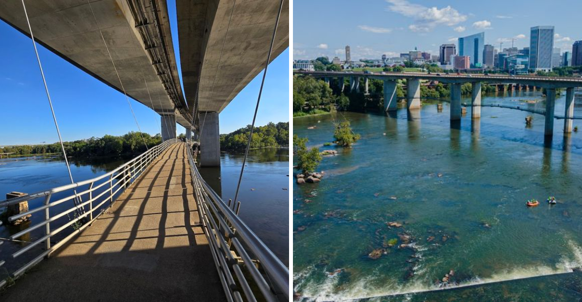 Above you, interstate traffic rumbles along, and below, the James River churns and sparkles.