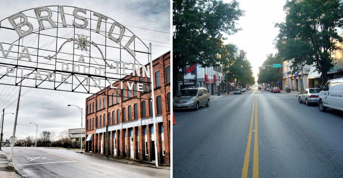 Here, the state line cuts right through the heart of downtown, splitting State Street cleanly between Virginia and Tennessee.