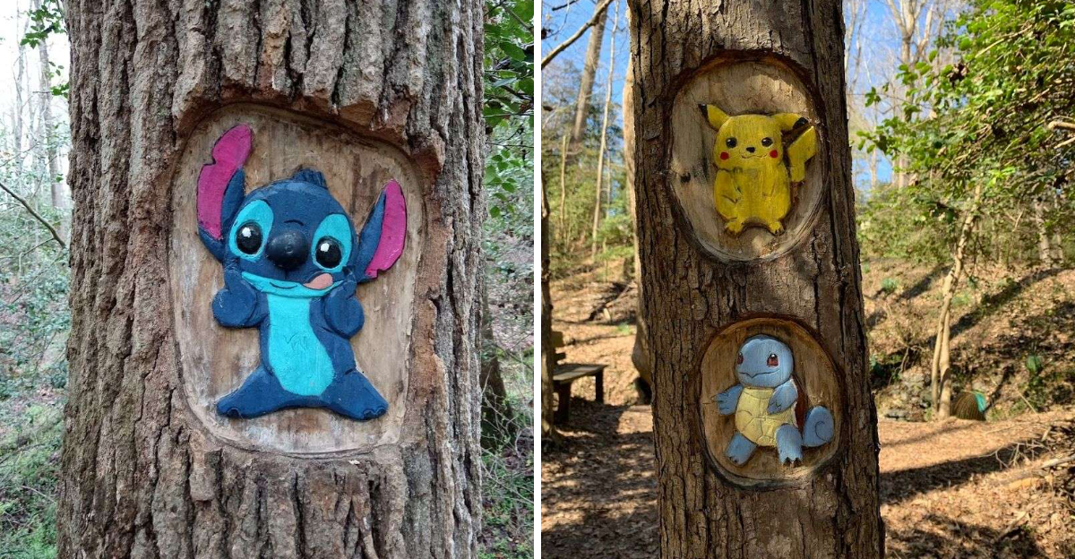 Minnie Mouse, The Lorax, and dozens of other instantly recognizable figures are scattered throughout the woods at varying heights. Some carvings sit at eye level while others are positioned higher up on the trunk, requiring a bit of neck-craning to fully appreciate.
