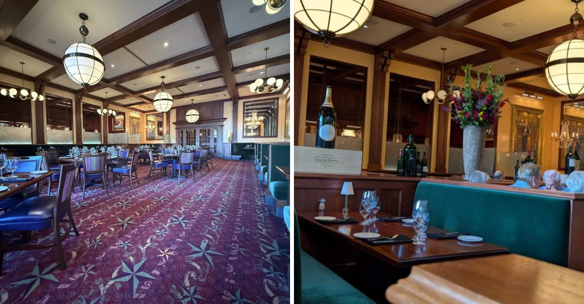 The carpeted floors add a layer of warmth and quiet, making conversations feel intimate even when the dining room is buzzing. Soft lighting casts a golden glow over everything, turning a regular dinner into something that feels like an occasion.