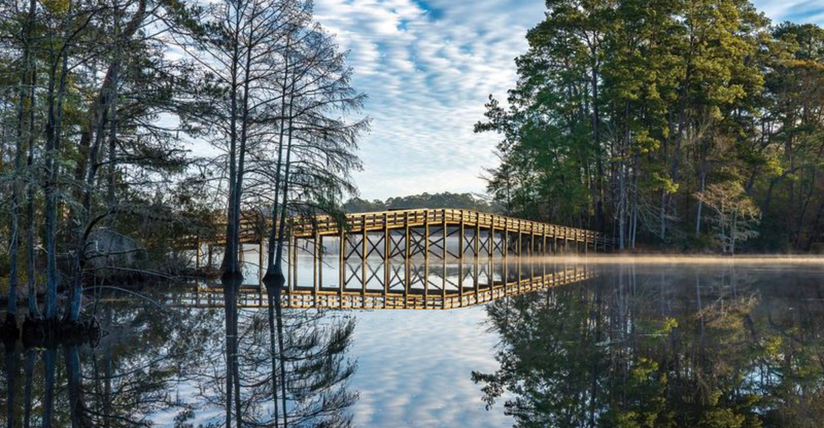 Loblolly pines soar overhead, creating a cathedral-like canopy that filters sunlight onto a carpet of pine needles. The trail’s flat terrain makes it accessible for hikers of all skill levels, while wooden boardwalks carry visitors over wetland areas teeming with life.