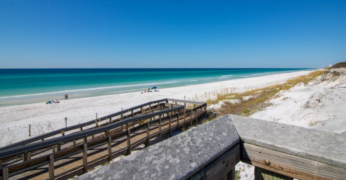 You step from the boardwalk into powdery sand that squeaks under your sandals, and the Gulf unfurls in gentle shades of teal.