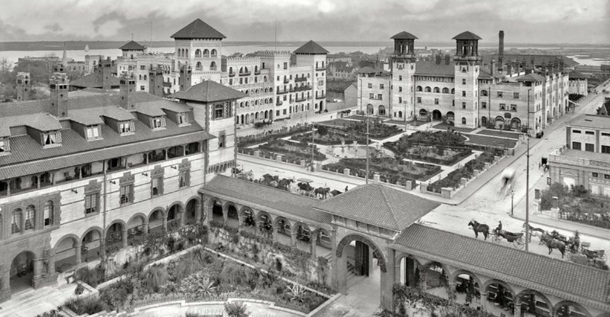 Cobblestone streets flanked by Spanish colonial architecture appear almost unchanged in photographs of St. Augustine from the 1880s. America’s oldest city, founded in 1565, became one of Florida’s first tourist destinations when Henry Flagler built the lavish Ponce de Leon Hotel in 1888, which appears in many early tourism photographs with horse-drawn trolleys waiting outside.
