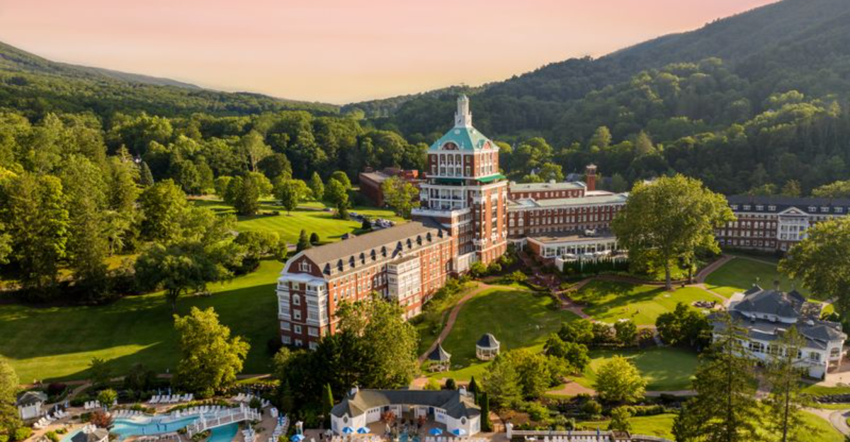 The Omni Homestead Resort stands as a landmark with broad lawns and tall windows.