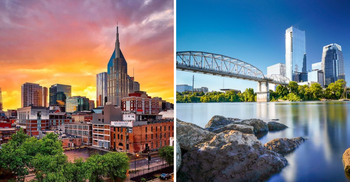 Downtown glows bright when the bulbs blink on, and Nashville turns reflective under cool Tennessee skies.