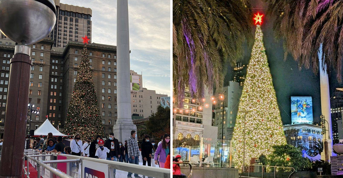 Union Square in California glows during the holidays, and the spectacle pulls in visitors from every direction.