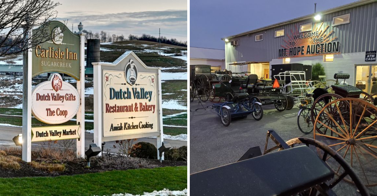 Horse drawn buggies clip by with a steady rhythm, guiding you toward a simpler pace.